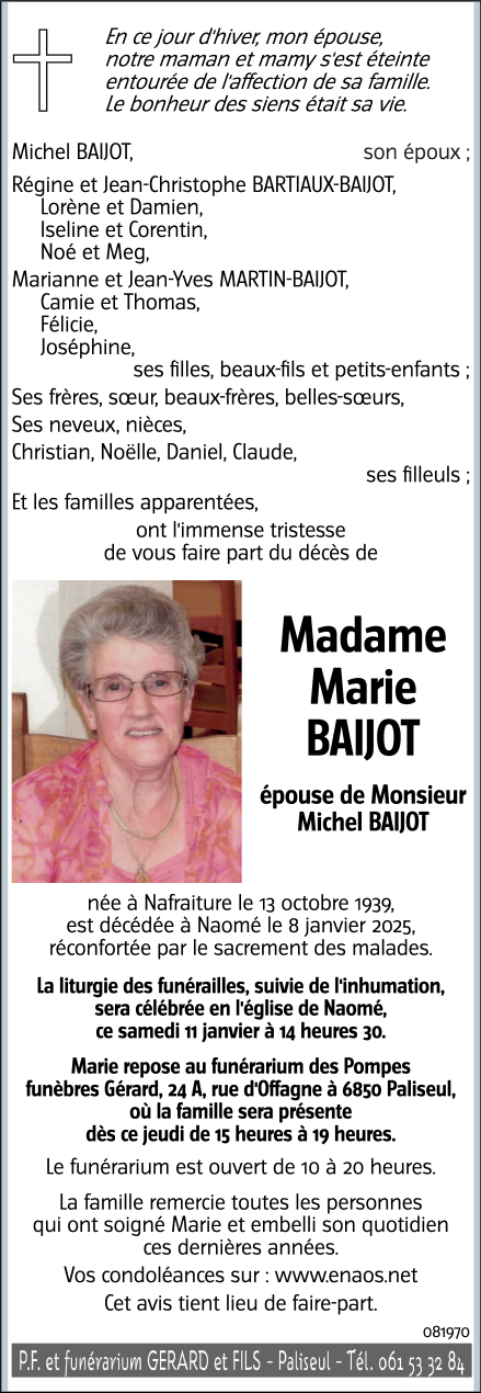 Décédée à Naomé (5555) le mercredi 8 janvier 2025 à l'âge de 85 ans