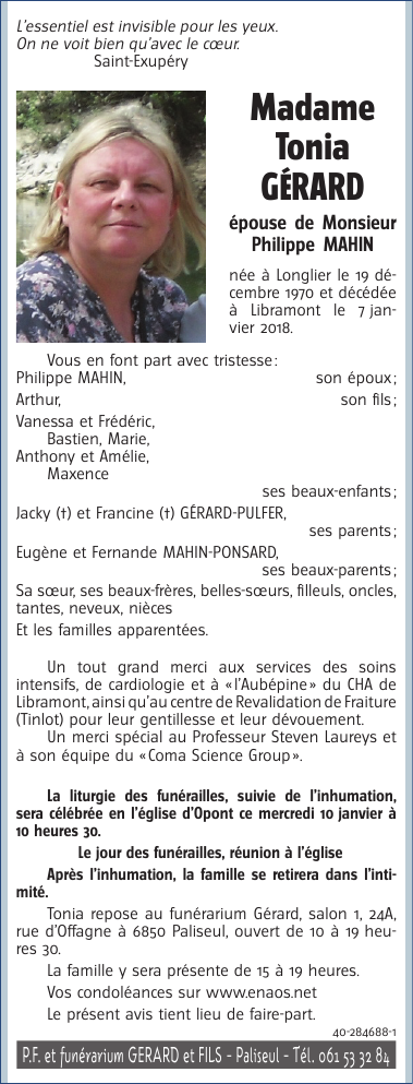 Décédée à Libramont (6800) le dimanche 7 janvier 2018 à l'âge de 47 ans