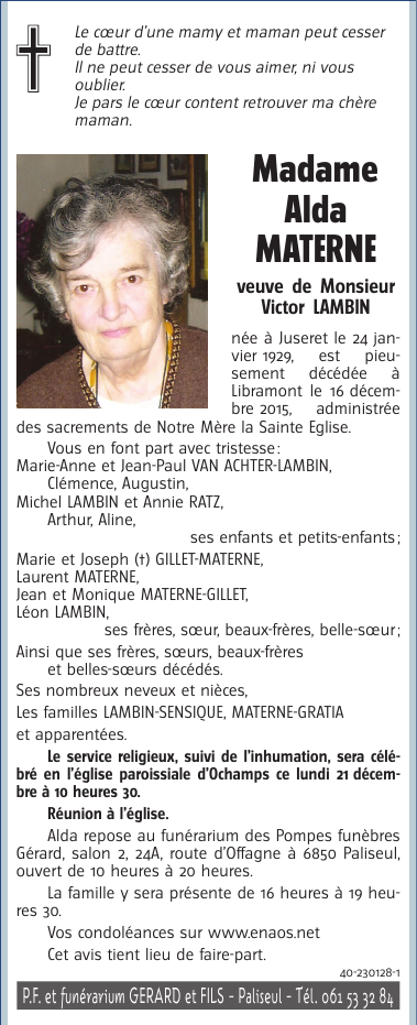 Décédée à Libramont (6800) le mercredi 16 décembre 2015 à l'âge de 86 ans