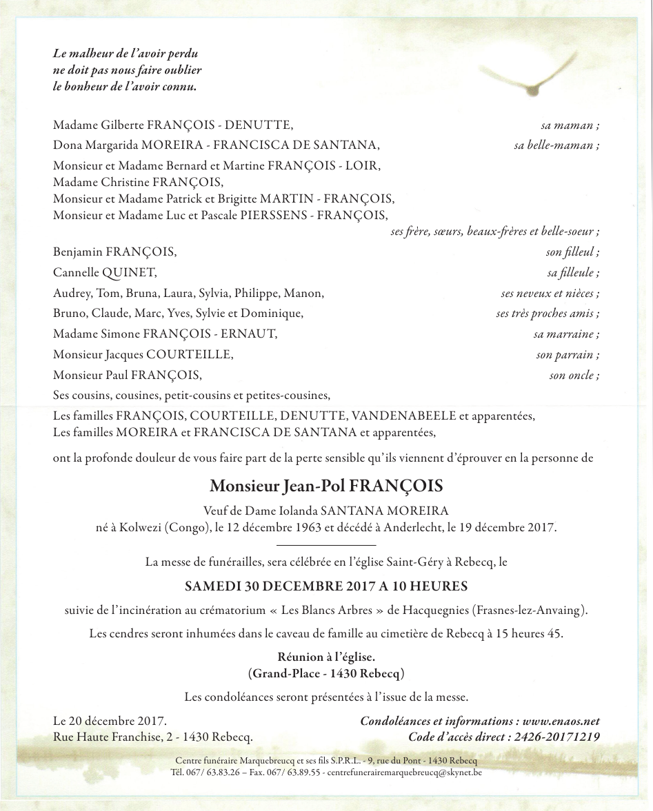 Fallecido en Bruxelles (Anderlecht) (1070) el martes, 19 de diciembre de 2017 a la edad de 54 años