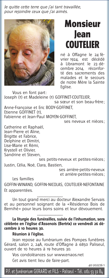 Died in Libramont (6800) on 23 December 2014 at the age of 90 years