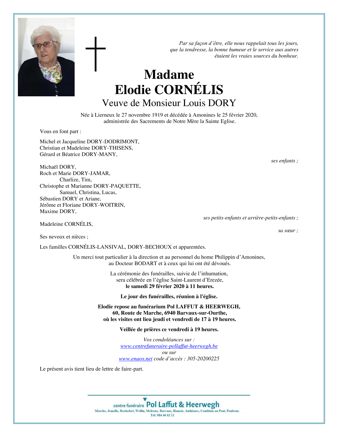 Décédée à Amonines (6997) le mardi 25 février 2020 à l'âge de 100 ans