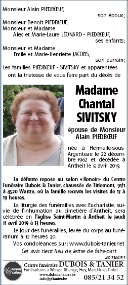 Décédée à Antheit (4520) le vendredi 5 avril 2019 à l'âge de 56 ans