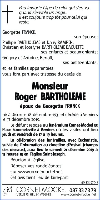Décédé à Verviers (4800) le mardi 17 décembre 2019 à l'âge de 87 ans