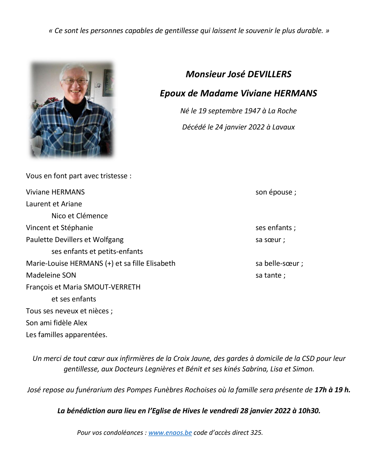 Décédé à Lavaux (6984) le lundi 24 janvier 2022 à l'âge de 74 ans