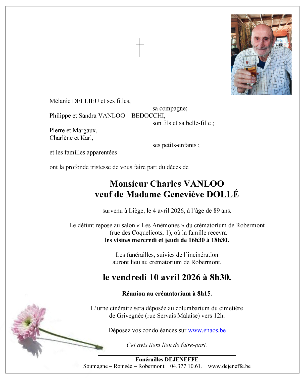 Décédé à Liège (4000) le samedi 4 avril 2026 à l'âge de 89 ans