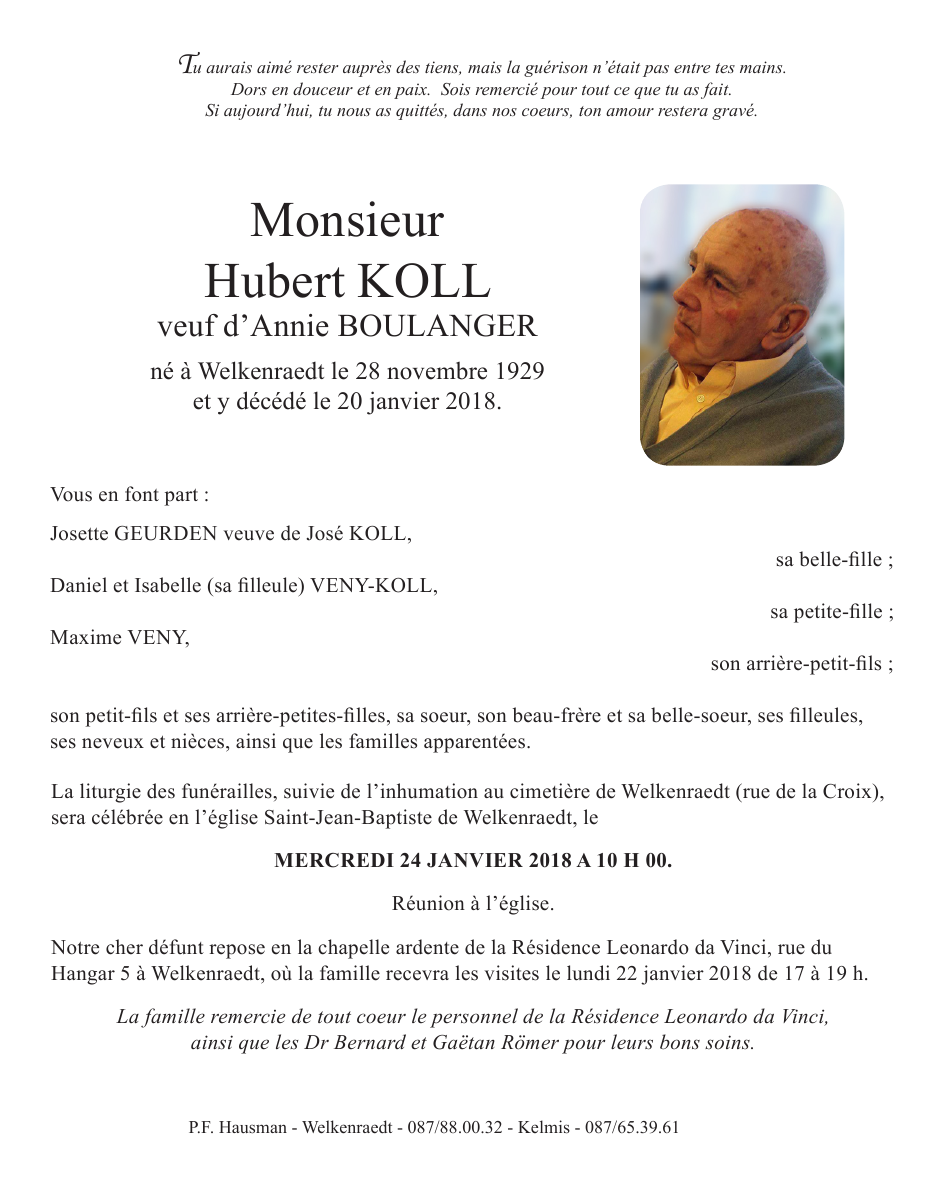 Décédé à Welkenraedt (4840) le samedi 20 janvier 2018 à l'âge de 88 ans
