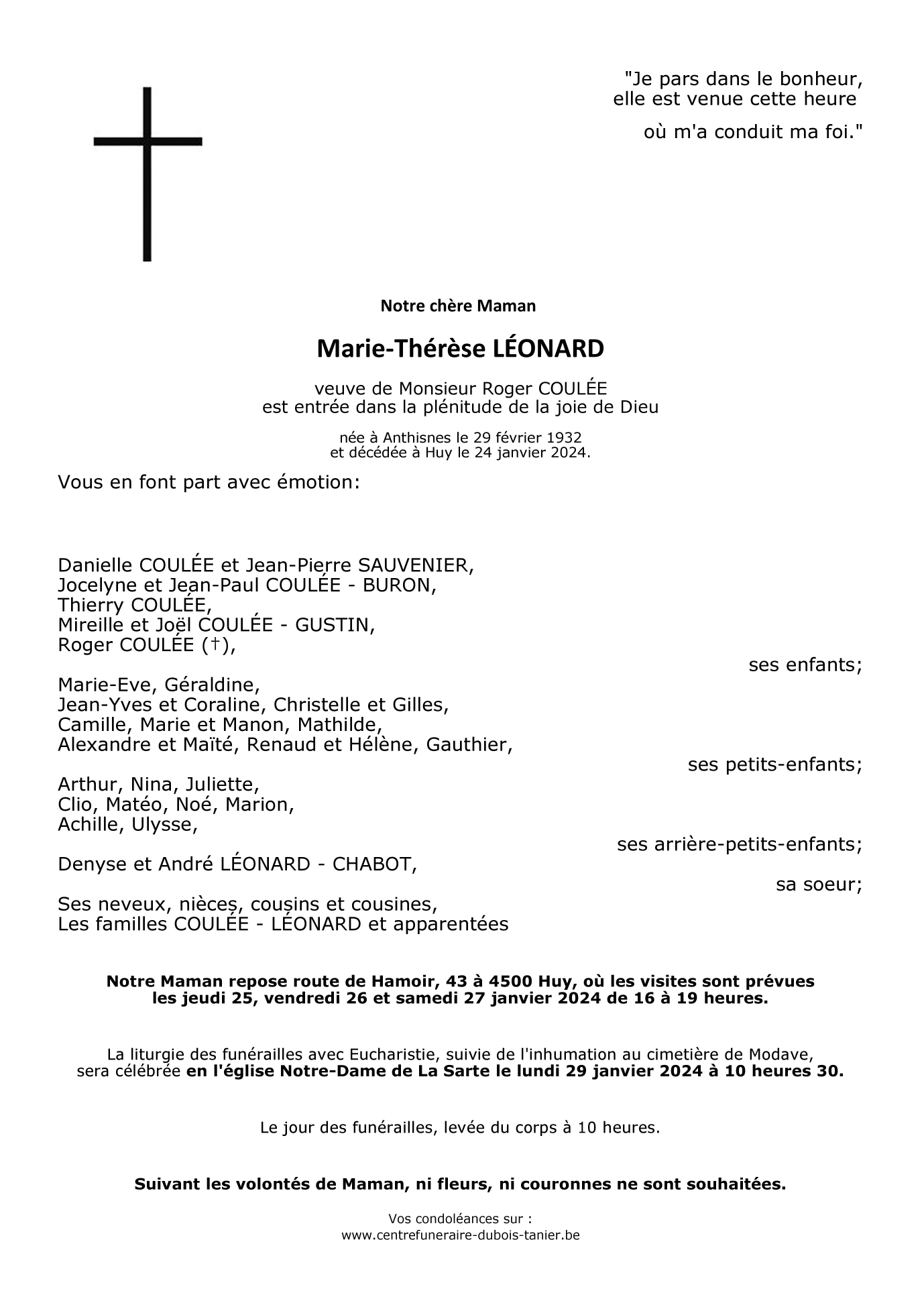 Overleden te Huy (4500) op woensdag 24 januari 2024 op 91-jarige leeftijd