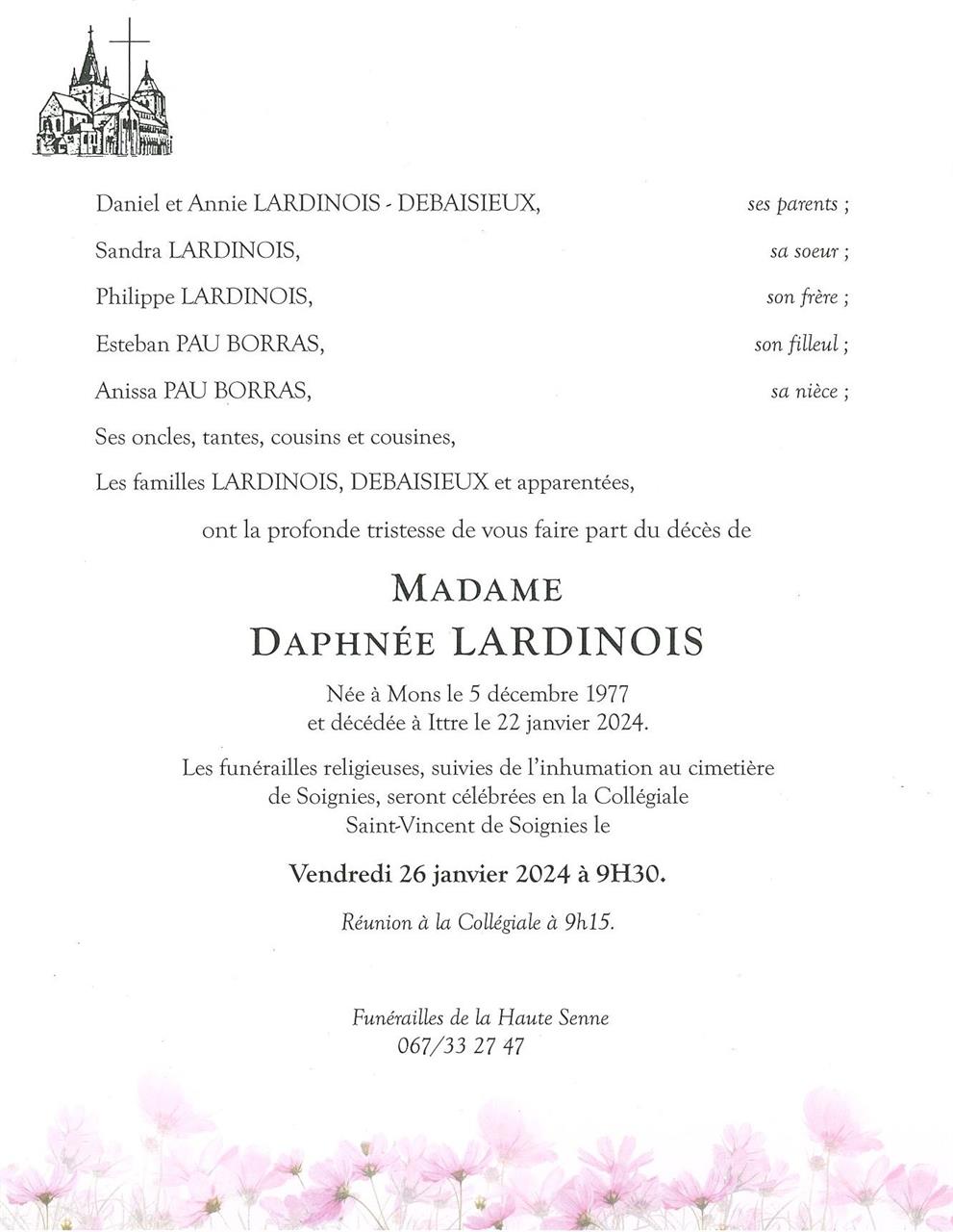 Décédée à Ittre (1460) le lundi 22 janvier 2024 à l'âge de 46 ans