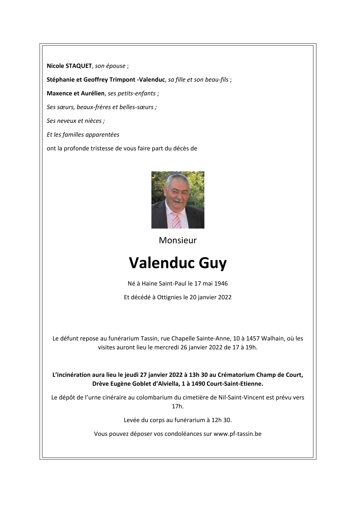 Died in Ottignies (1340) on 20 January 2022 at the age of 75 years