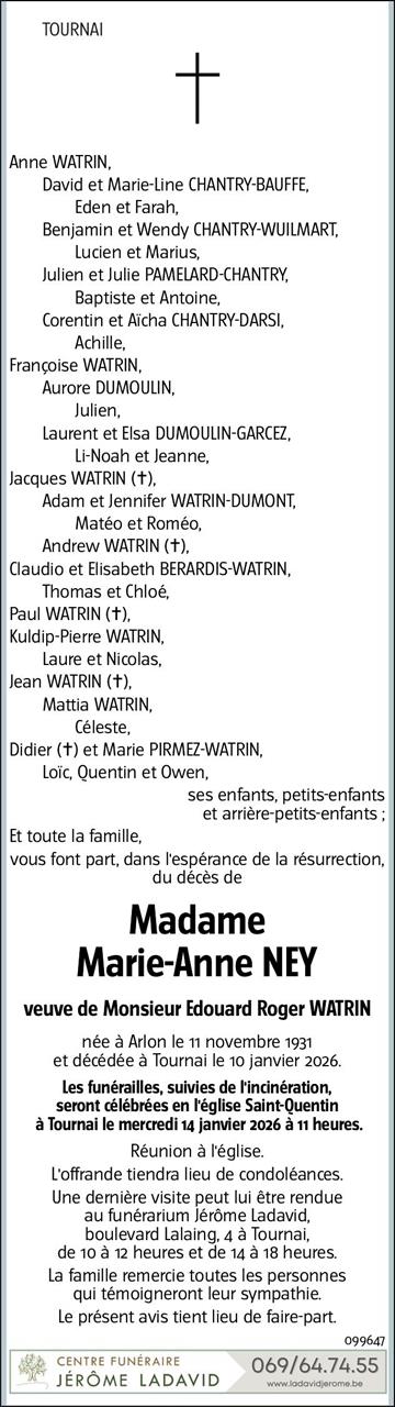 Décédée à Tournai (7500) le samedi 10 janvier 2026 à l'âge de 94 ans