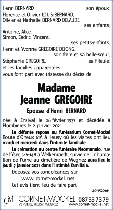 Décédée à Plombières (4850) le samedi 2 janvier 2021 à l'âge de 83 ans