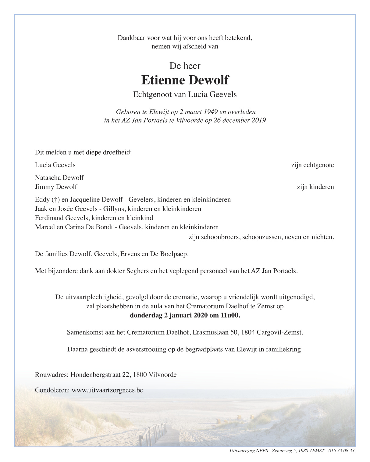 Décédé à Vilvoorde (1800) le jeudi 26 décembre 2019 à l'âge de 70 ans