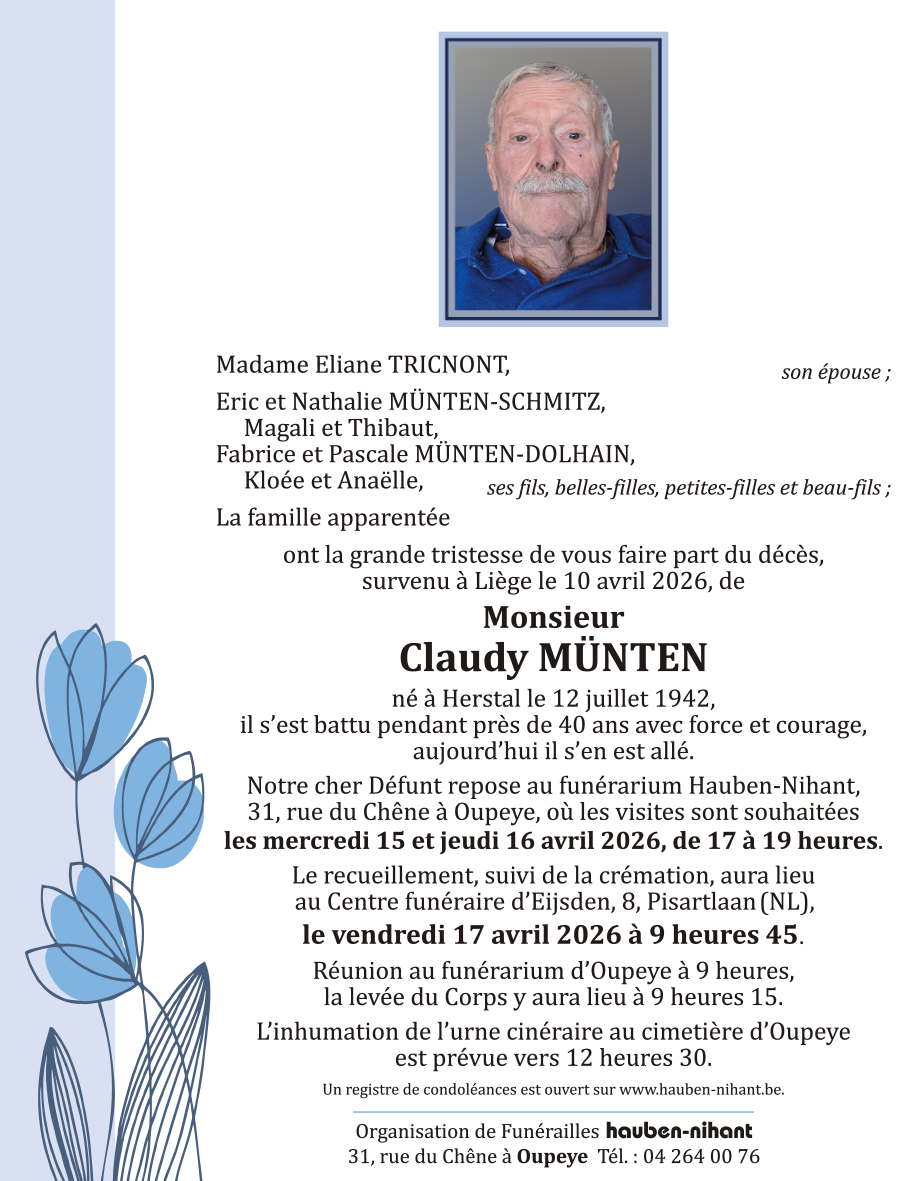 Décédé à Liège (4000) le vendredi 10 avril 2026 à l'âge de 83 ans