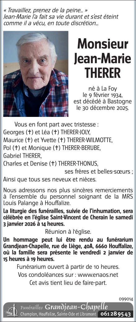 Décédé à Bastogne (6600) le mercredi 31 décembre 2025 à l'âge de 91 ans