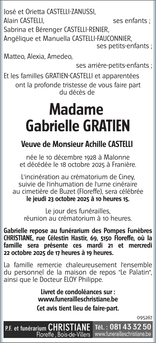 Décédée à Floreffe (5150) le samedi 18 octobre 2025 à l'âge de 96 ans