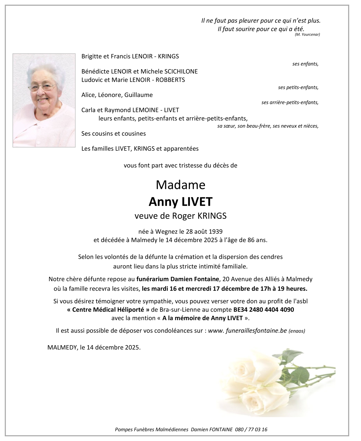 Décédée à Malmedy (4960) le dimanche 14 décembre 2025 à l'âge de 86 ans