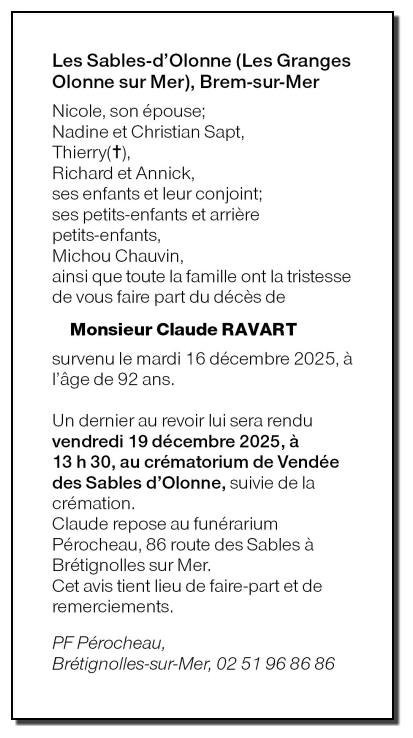 Décédé à Les Sables d'Olonne (85100, France) le mardi 16 décembre 2025 à l'âge de 92 ans