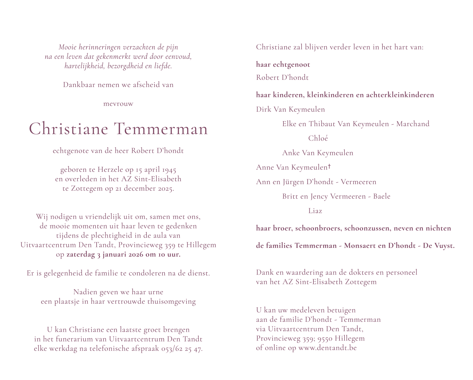 Fallecida en Zottegem (9620) el domingo, 21 de diciembre de 2025 a la edad de 80 años