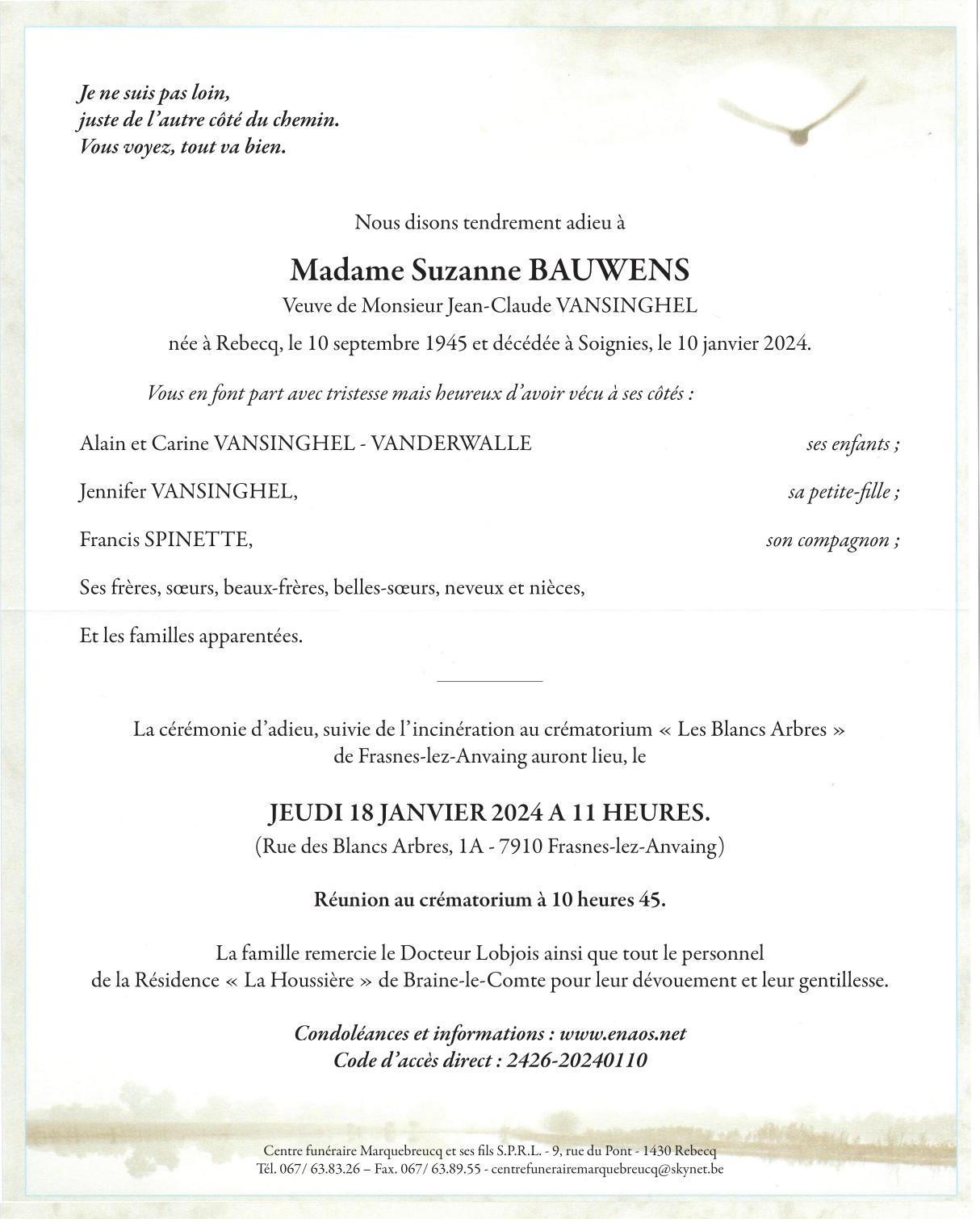 Weduwe van Monsieur Jean-Claude VANSINGHEL