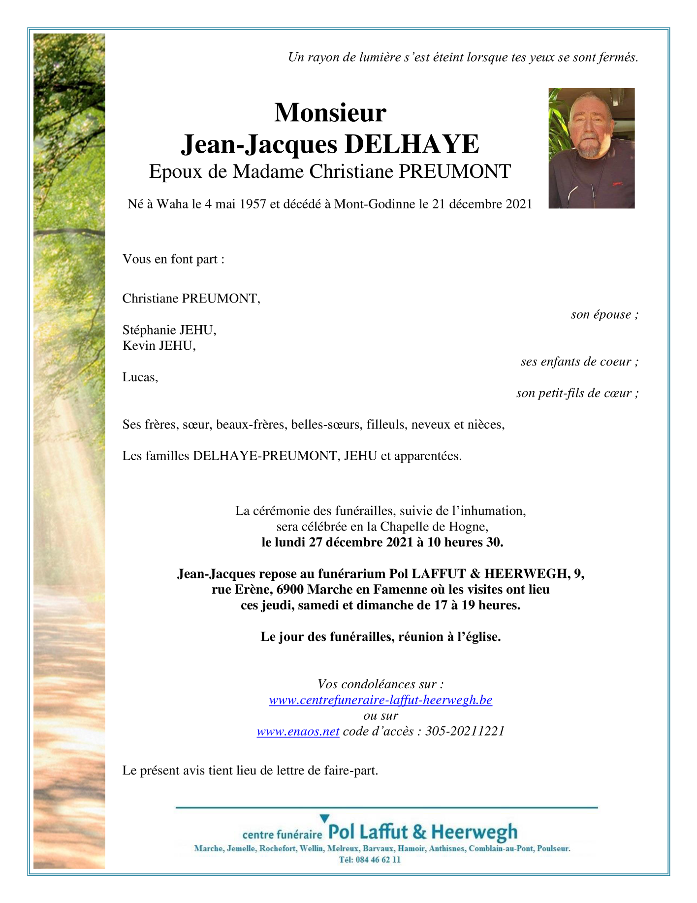 Décédé à Mont-Godinne (5530) le mardi 21 décembre 2021 à l'âge de 64 ans