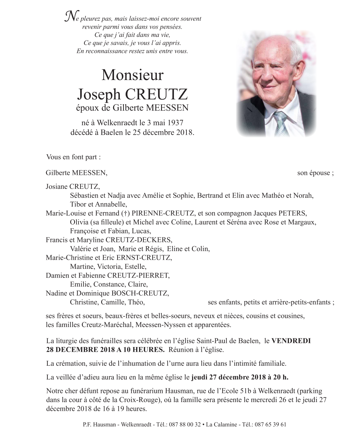 Décédé à Baelen (Lg.) (4837) le mardi 25 décembre 2018 à l'âge de 81 ans