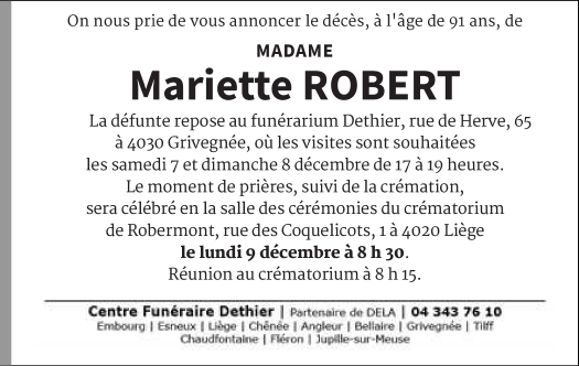 Fallecida en Grivegnée (4030) el lunes, 2 de diciembre de 2024 a la edad de 91 años
