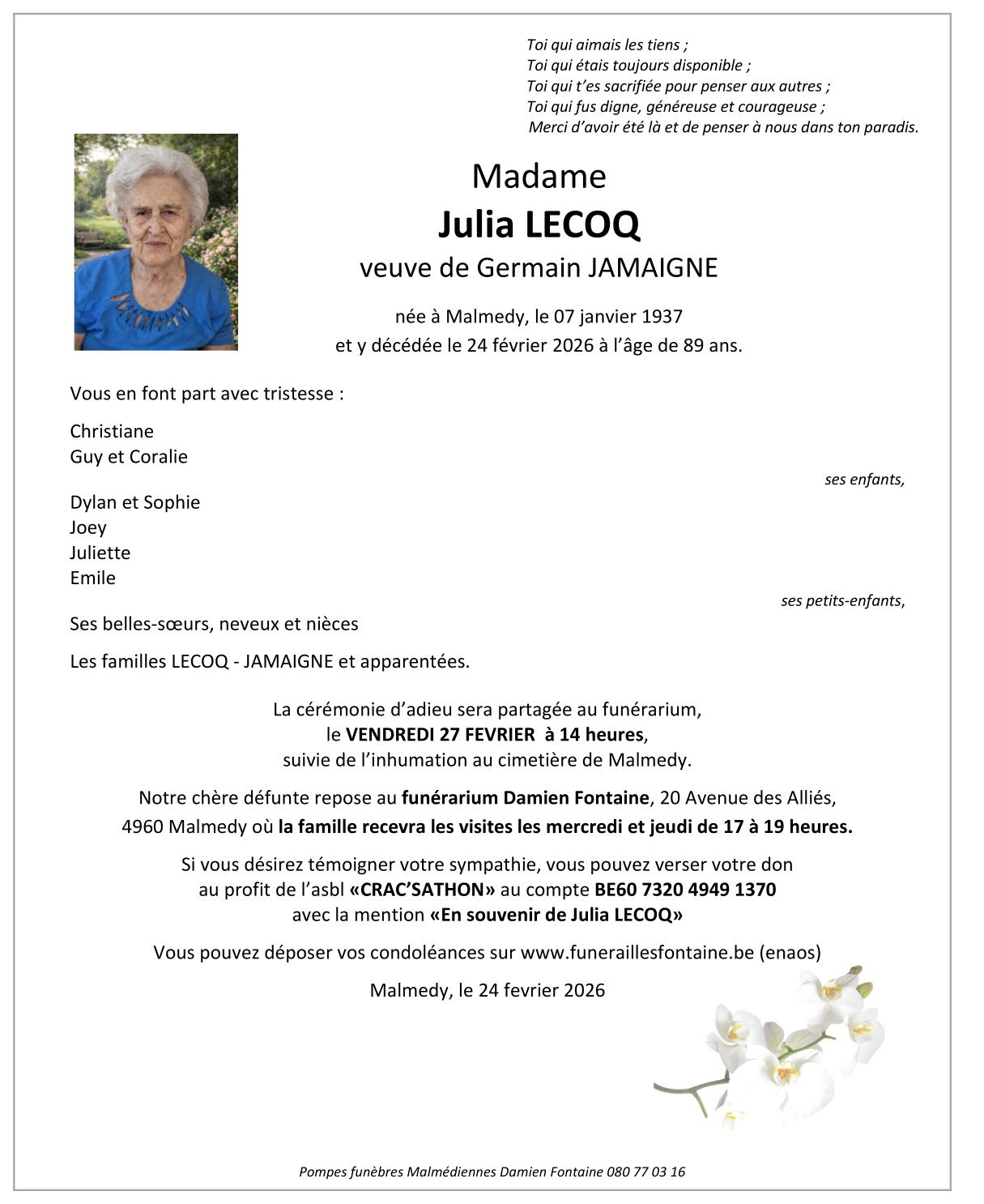 Fallecida en Malmedy (4960) el martes, 24 de febrero de 2026 a la edad de 89 años
