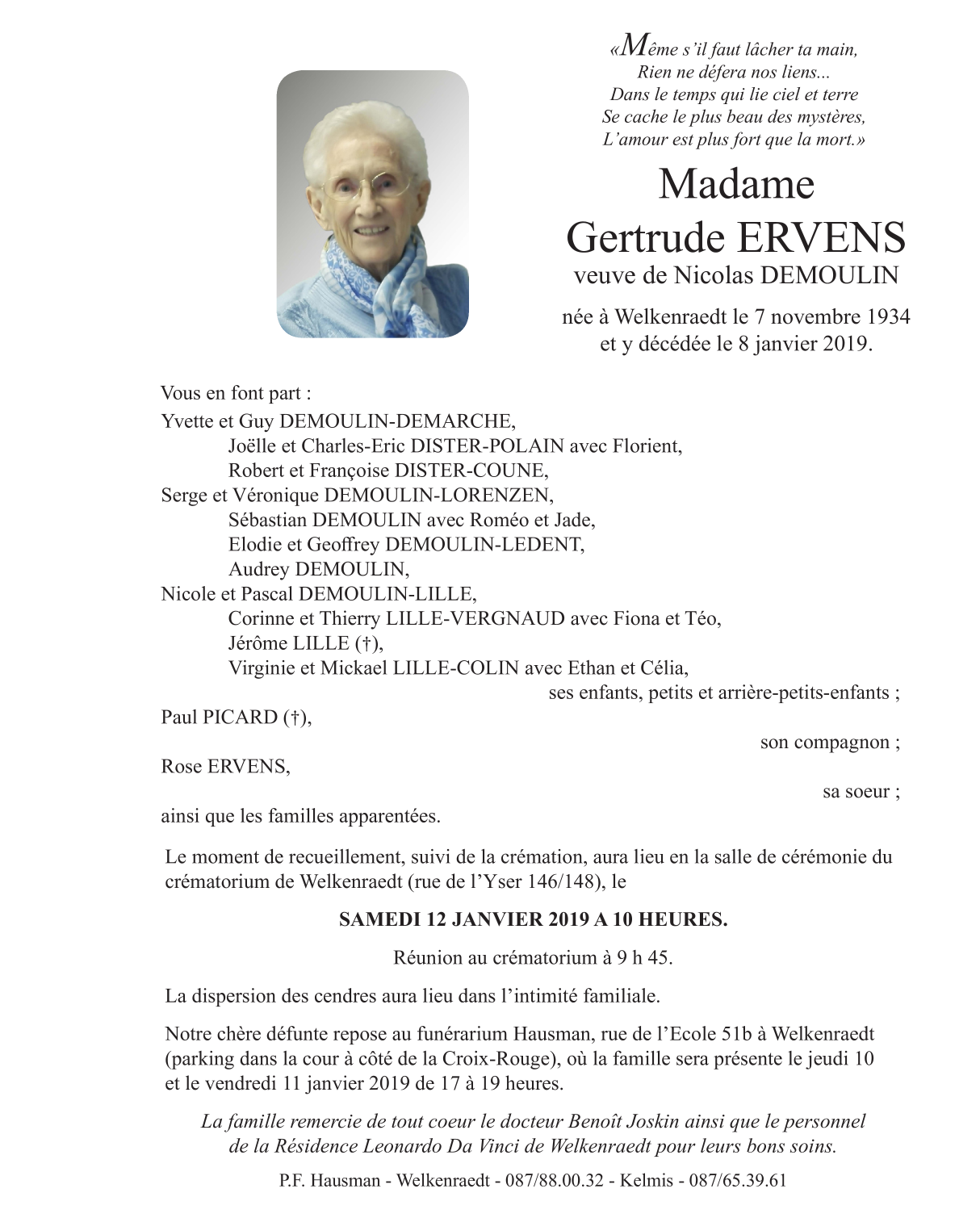 Died in Welkenraedt (4840) on 08 January 2019 at the age of 84 years