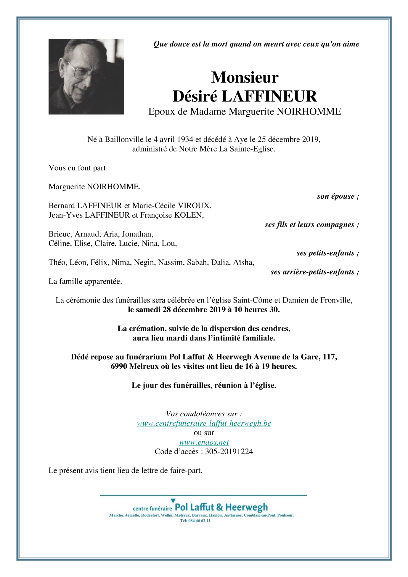Died in Aye (6900) on 25 December 2019 at the age of 85 years