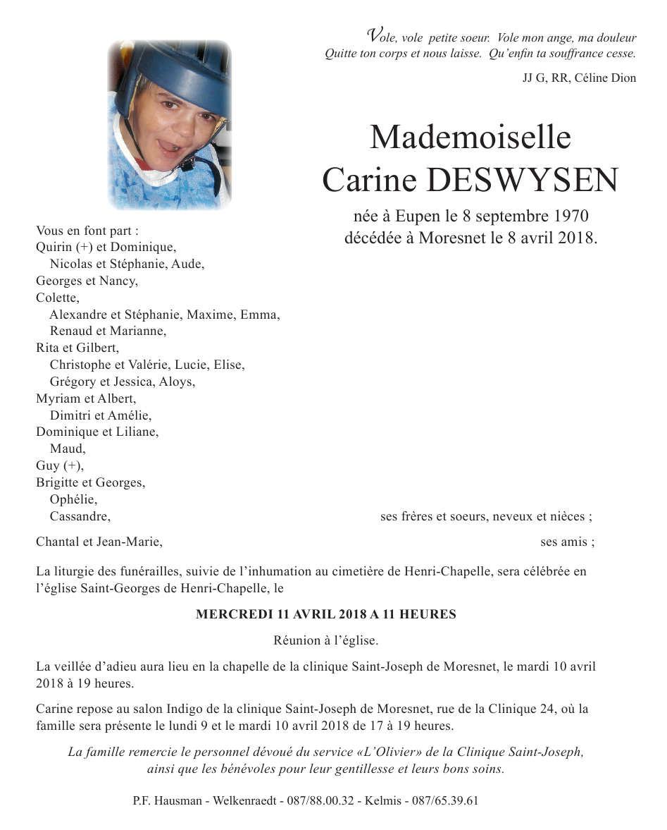 Décédée à Moresnet (4850) le dimanche 8 avril 2018 à l'âge de 47 ans
