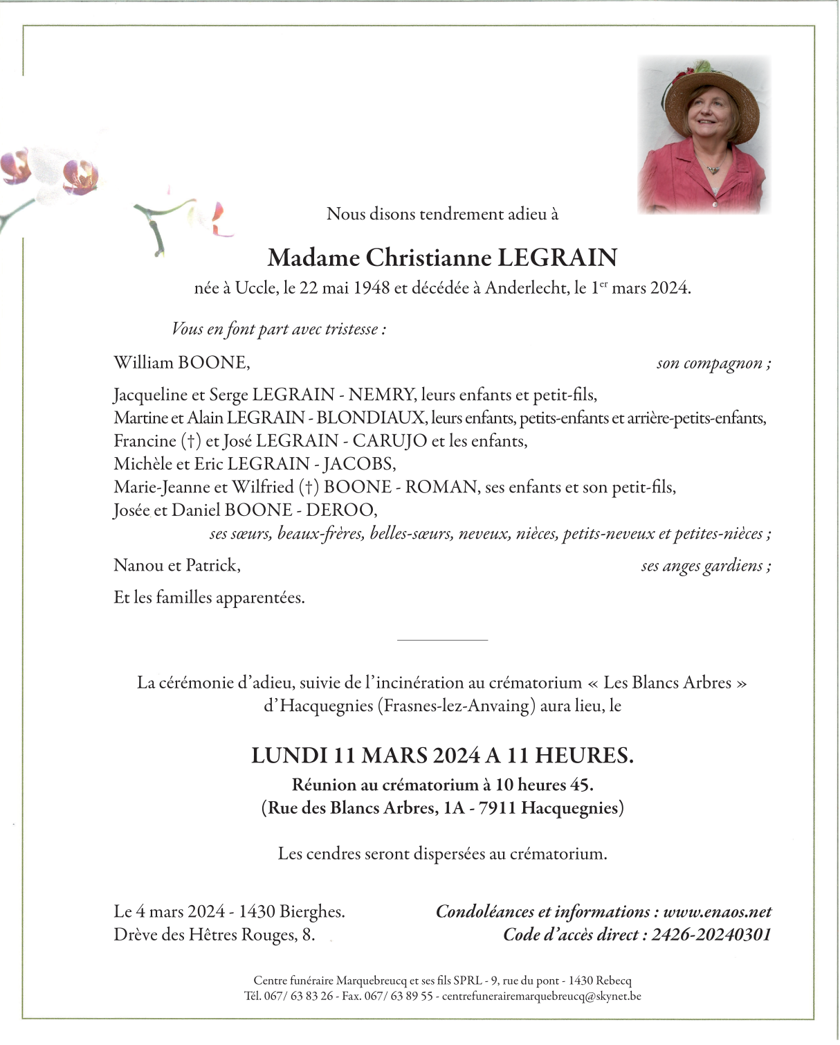 Décédée à Anderlecht (1070) le vendredi 1 mars 2024 à l'âge de 75 ans