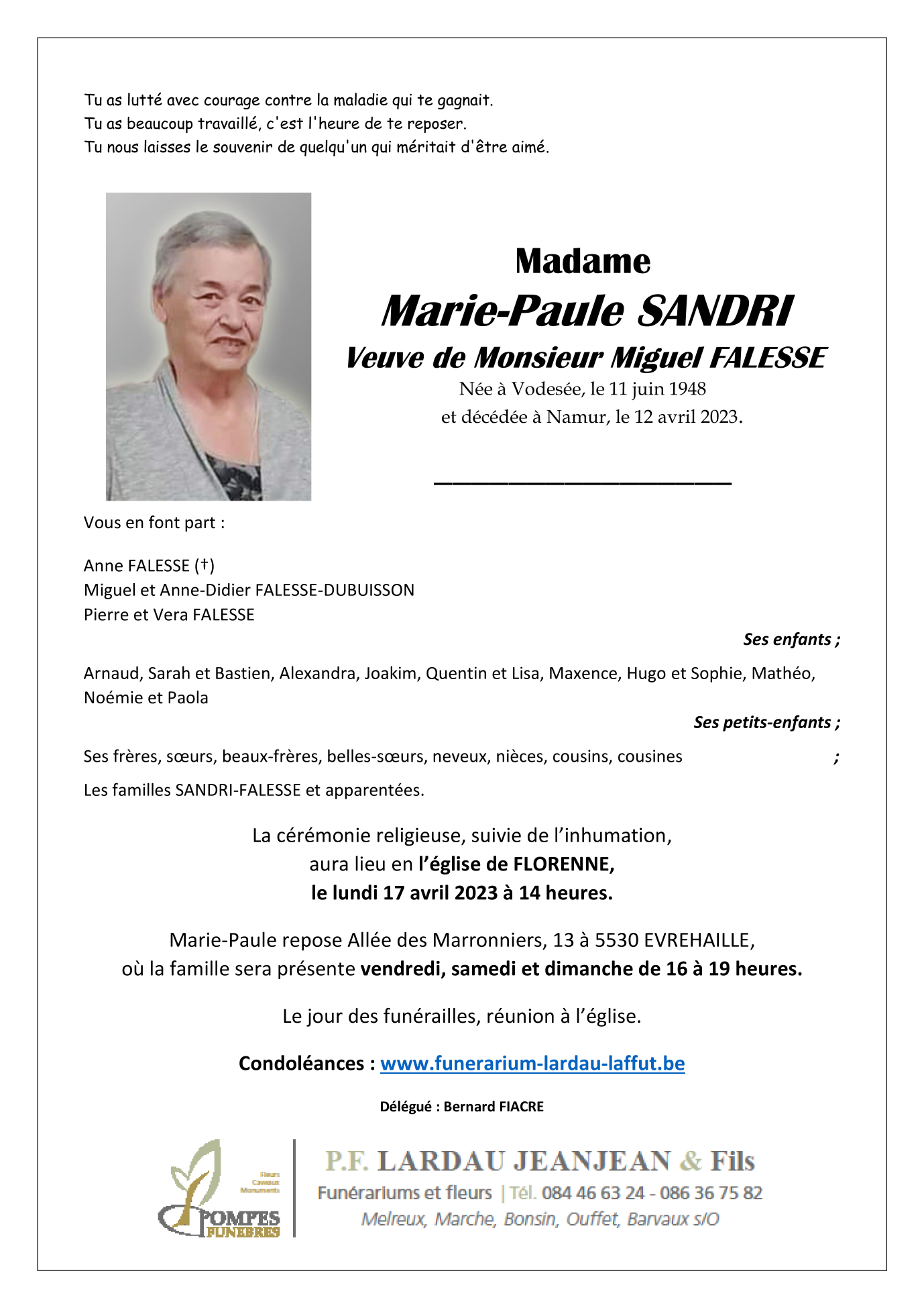 Died in Namur (5000) on 12 April 2023 at the age of 74 years