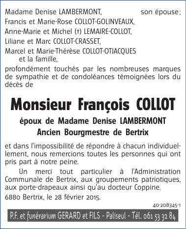 Décédé à Libramont (6800) le mardi 17 février 2015 à l'âge de 90 ans