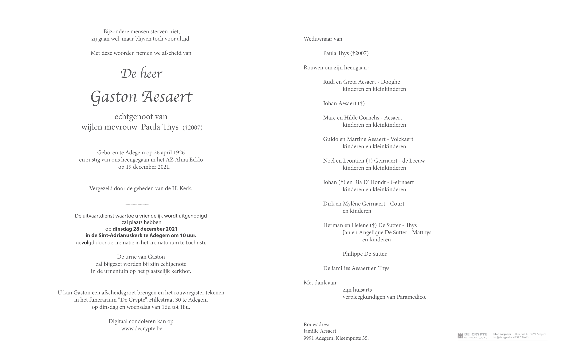 Died in Eeklo (9900) on 19 December 2021 at the age of 95 years
