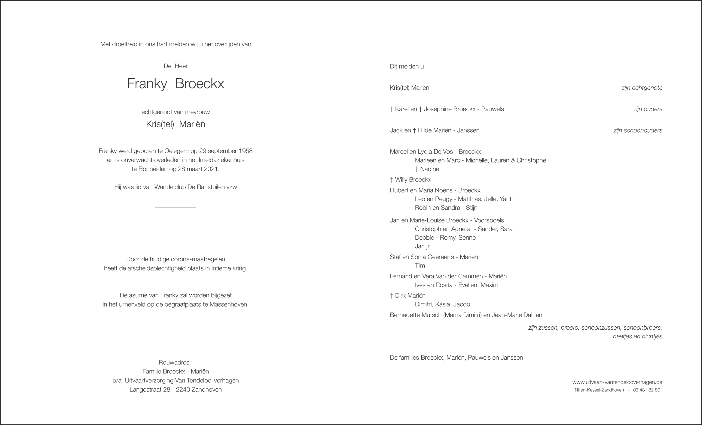 Fallecido en Bonheiden (2820) el domingo, 28 de marzo de 2021 a la edad de 62 años