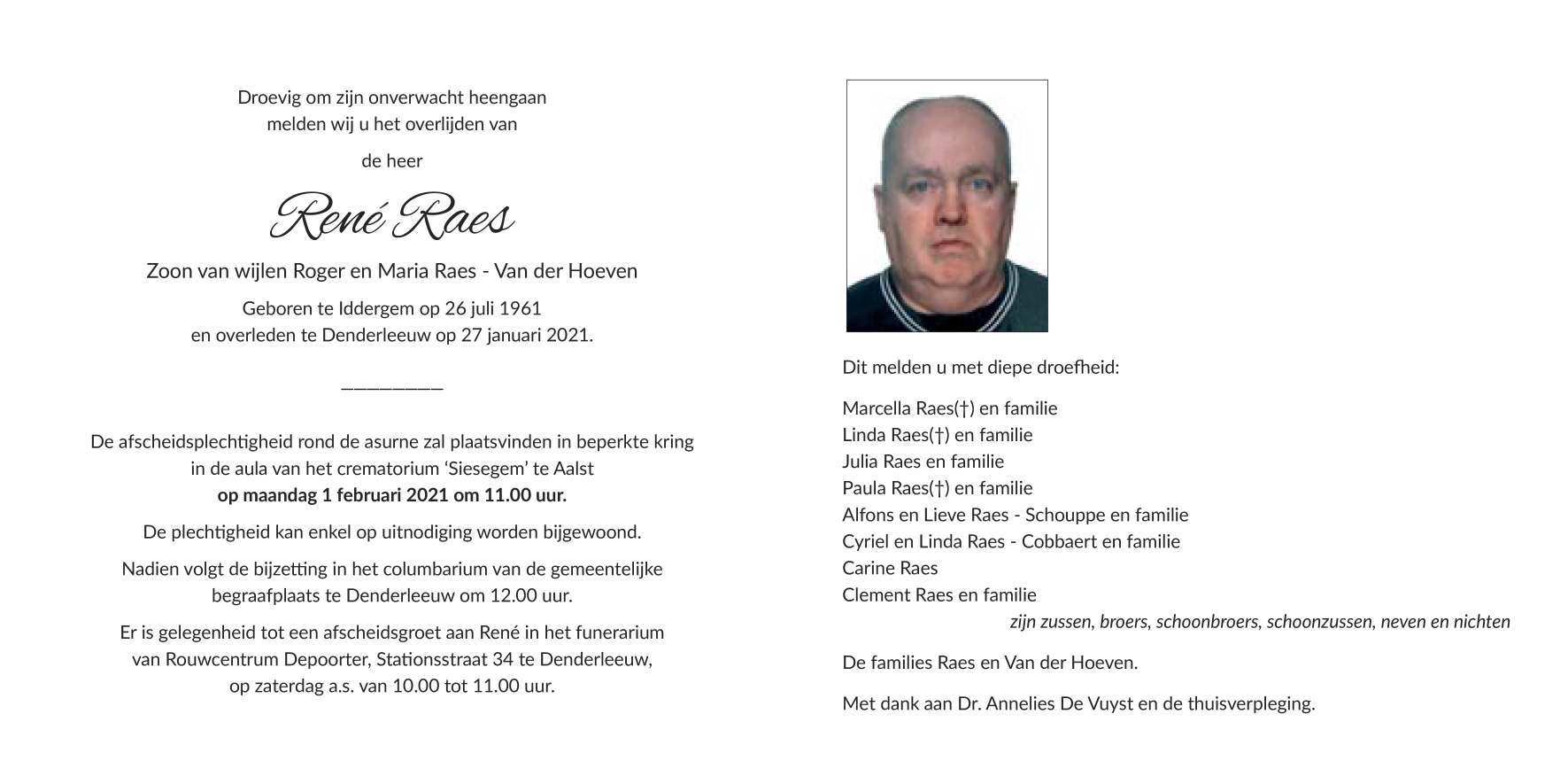 Décédé à Denderleeuw (9470) le mercredi 27 janvier 2021 à l'âge de 59 ans