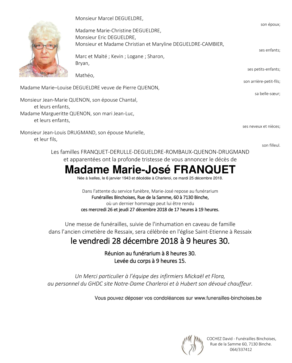 Fallecida en Charleroi (6000) el martes, 25 de diciembre de 2018 a la edad de 75 años