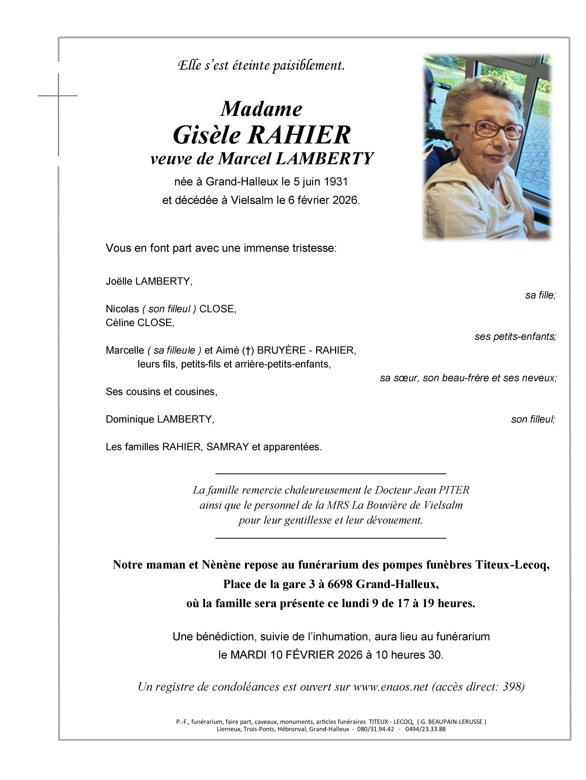 Décédée à Vielsalm (6690) le vendredi 6 février 2026 à l'âge de 94 ans