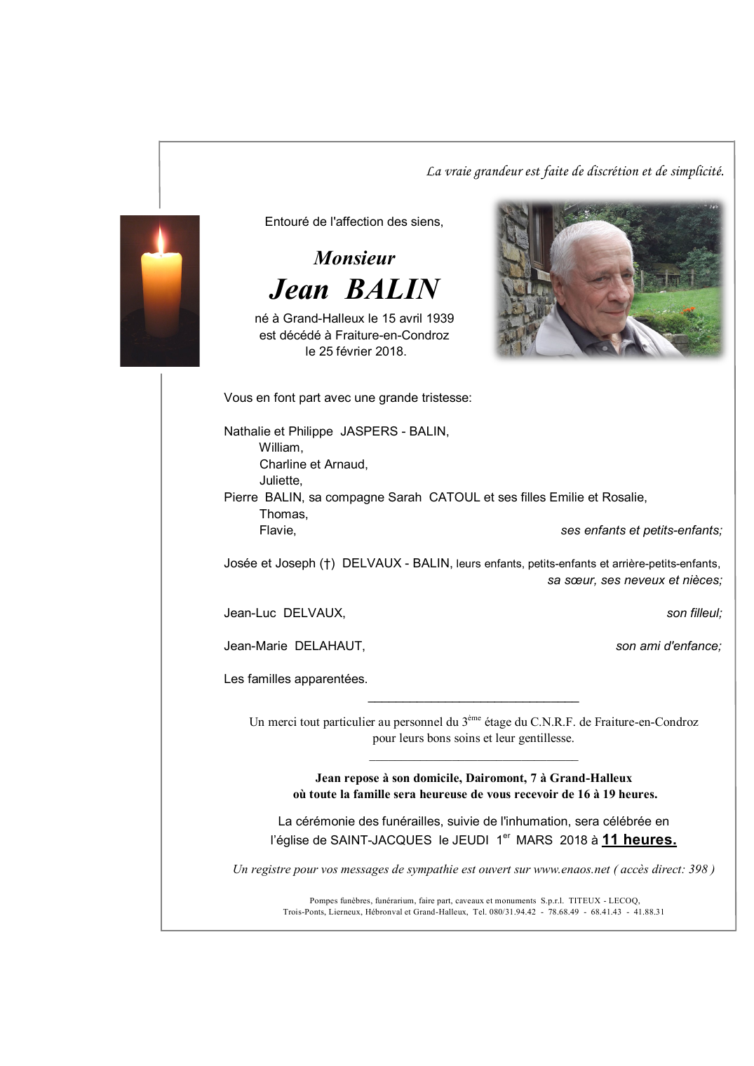 Décédé à Fraiture (4557) le dimanche 25 février 2018 à l'âge de 78 ans