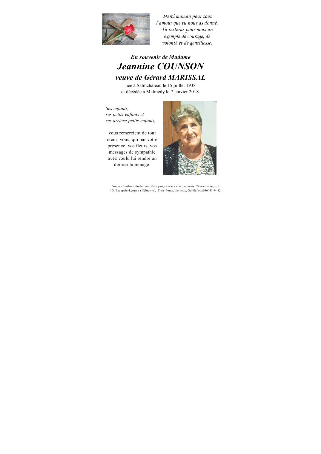 Décédée à Malmedy (4960) le dimanche 7 janvier 2018 à l'âge de 79 ans