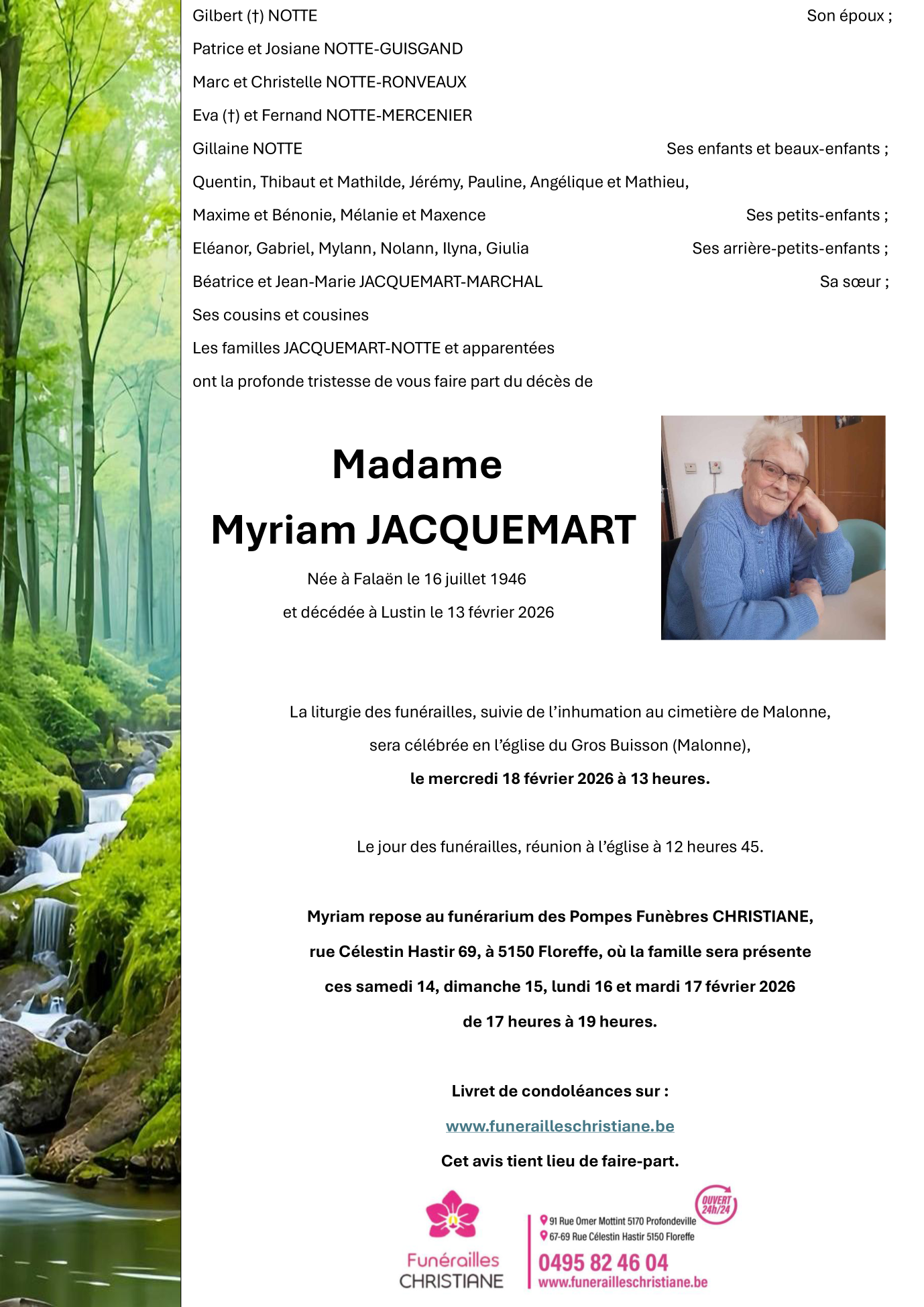 Décédée à Lustin (5170) le vendredi 13 février 2026 à l'âge de 79 ans