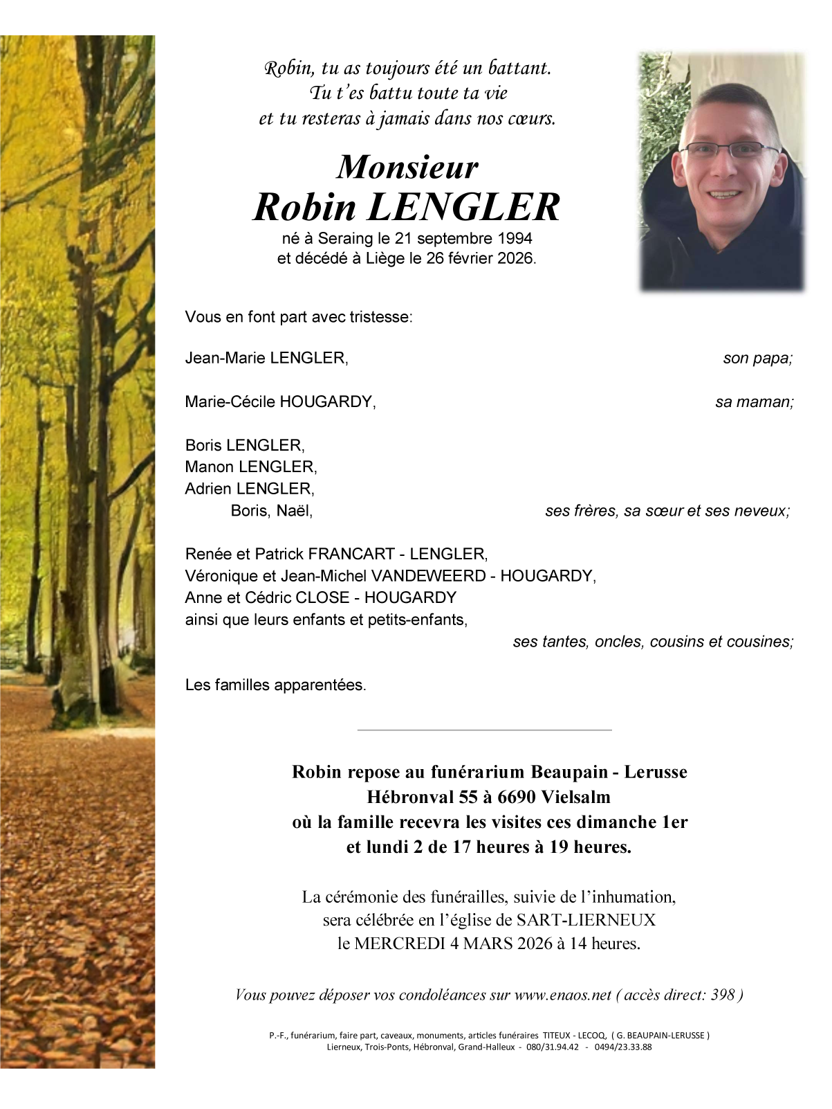 Décédé à Liège (4000) le jeudi 26 février 2026 à l'âge de 31 ans