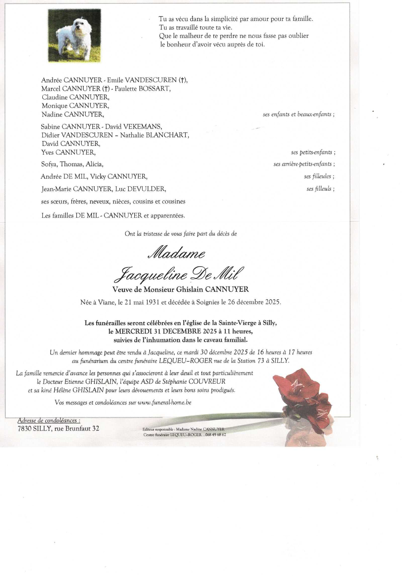 Décédée à Soignies (7060) le vendredi 26 décembre 2025 à l'âge de 94 ans