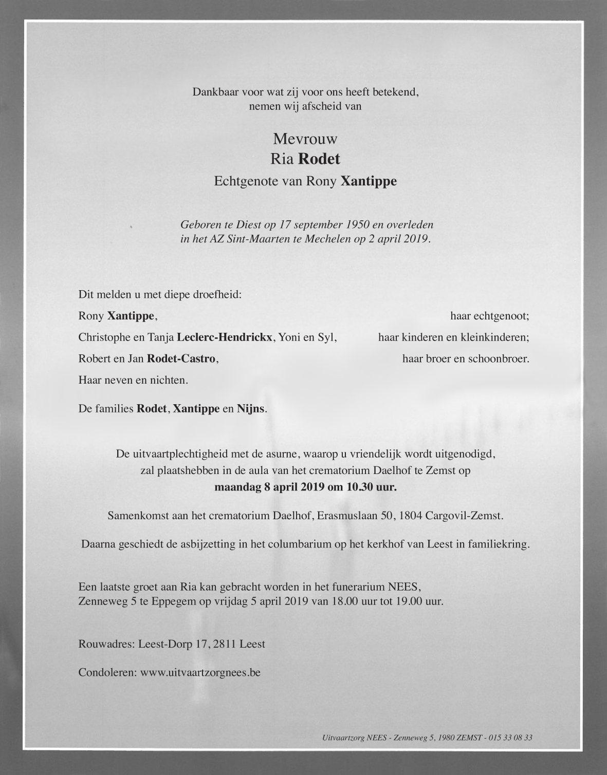 Died in Mechelen (2800) on 02 April 2019 at the age of 68 years