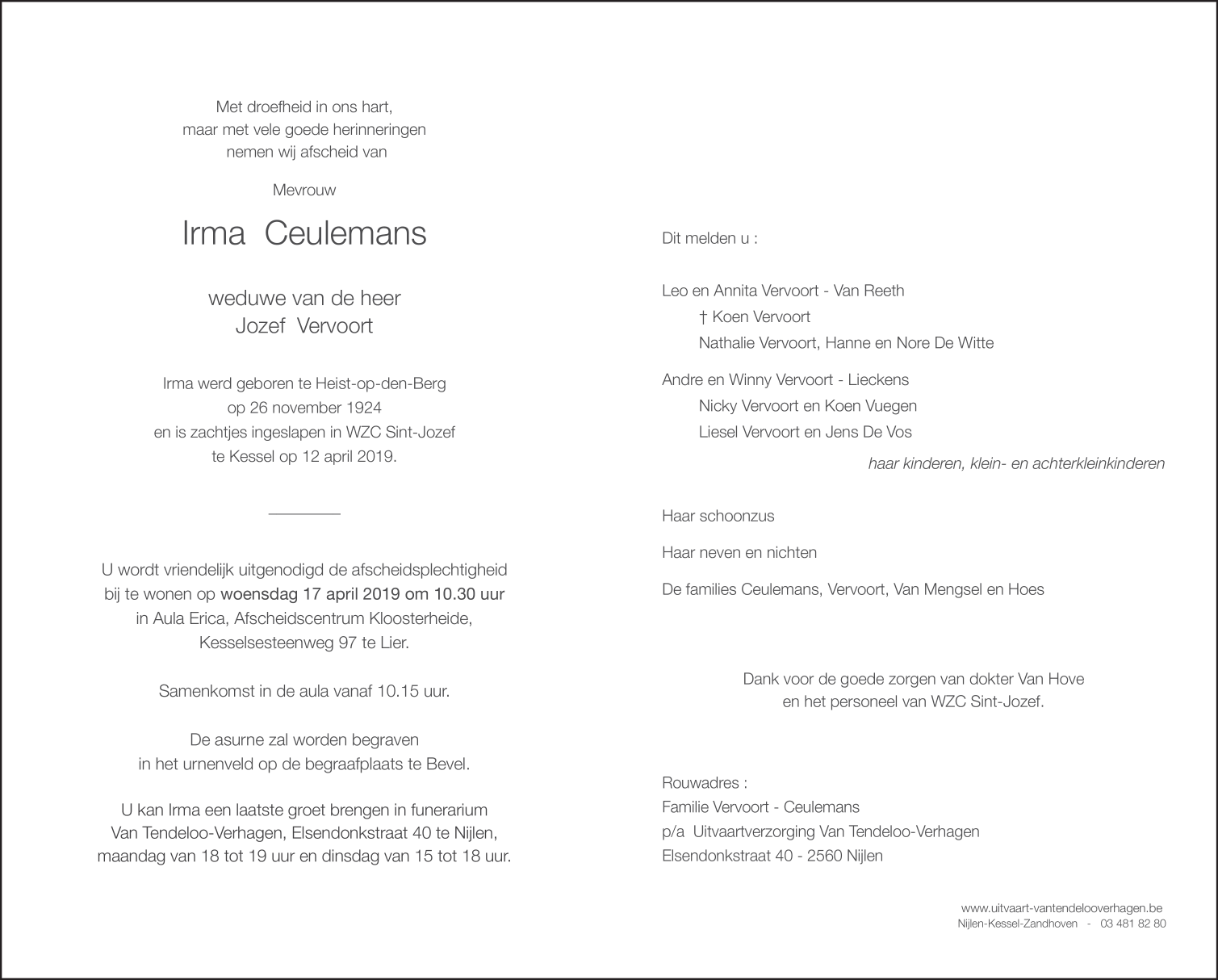 Overleden te Kessel (2560) op vrijdag 12 april 2019 op 94-jarige leeftijd