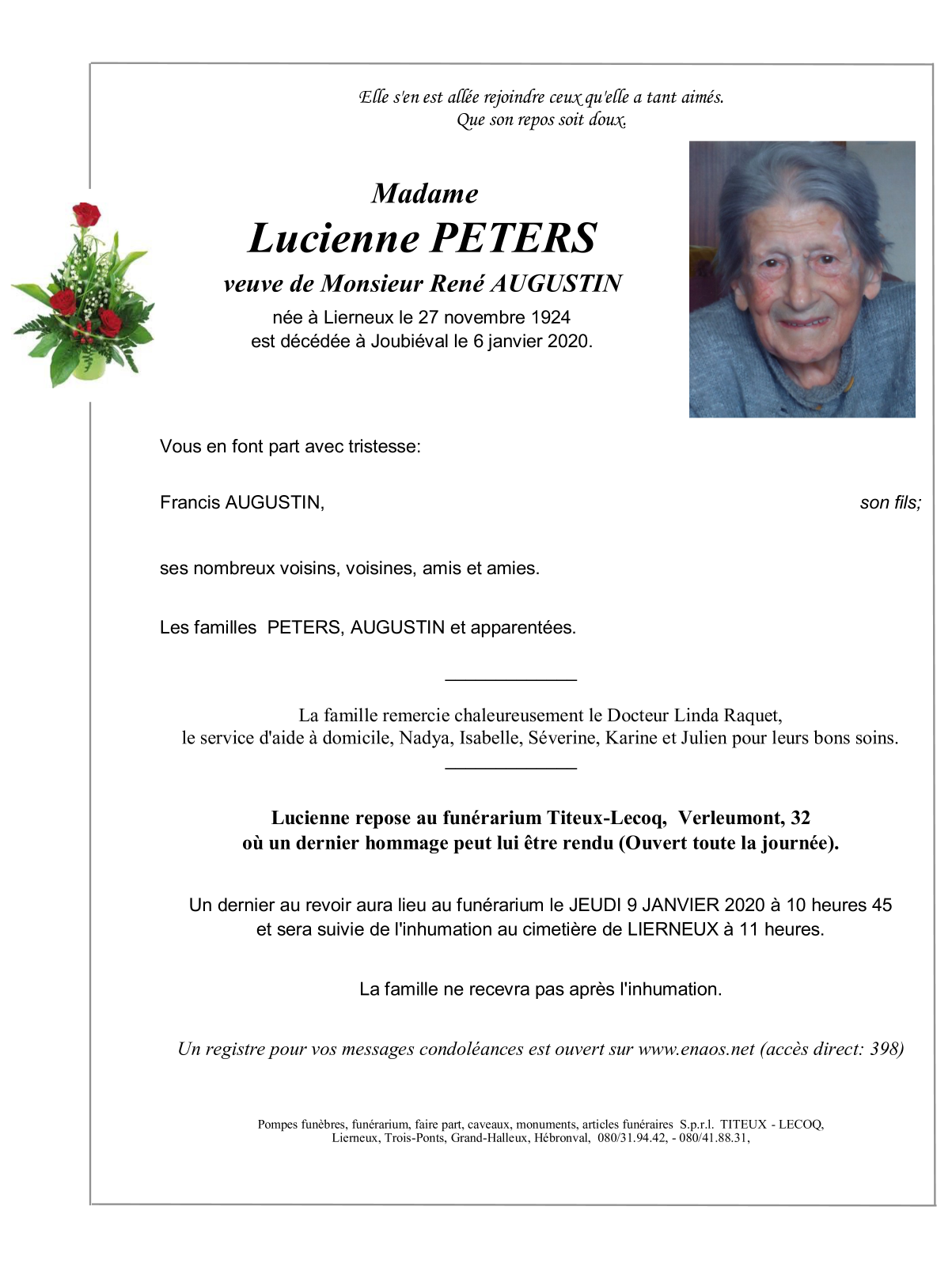 Née à Lierneux (4990) le jeudi 27 novembre 1924
