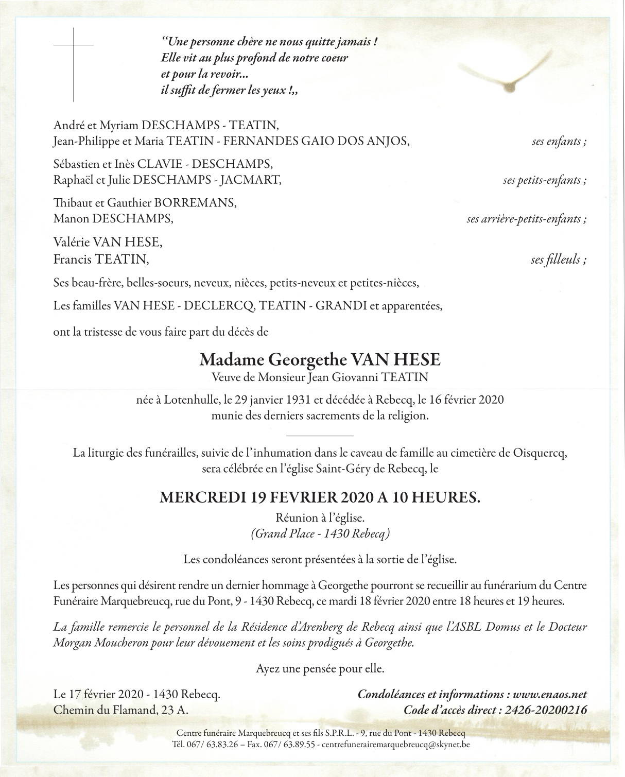 Fallecida en Rebecq (1430) el domingo, 16 de febrero de 2020 a la edad de 89 años