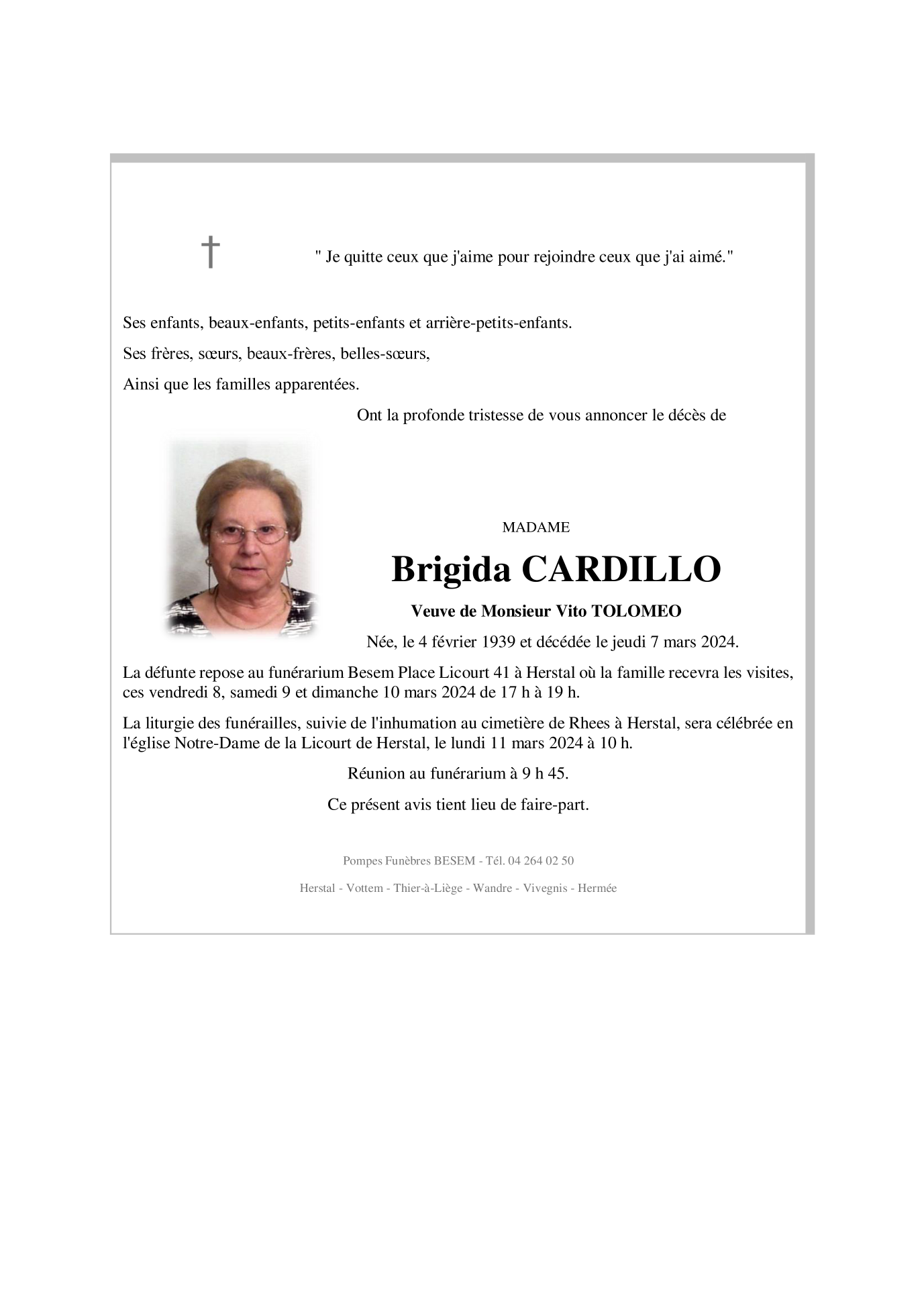 Fallecida en Liège (4000) el jueves, 7 de marzo de 2024 a la edad de 85 años