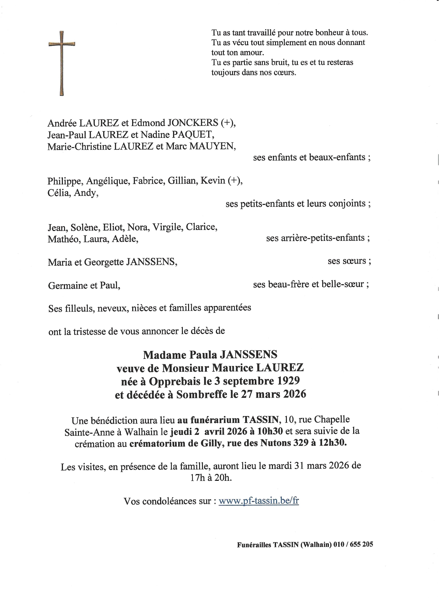 Décédée à Sombreffe (5140) le vendredi 27 mars 2026 à l'âge de 96 ans